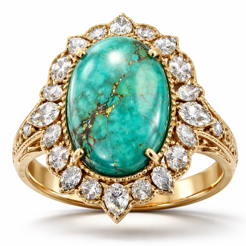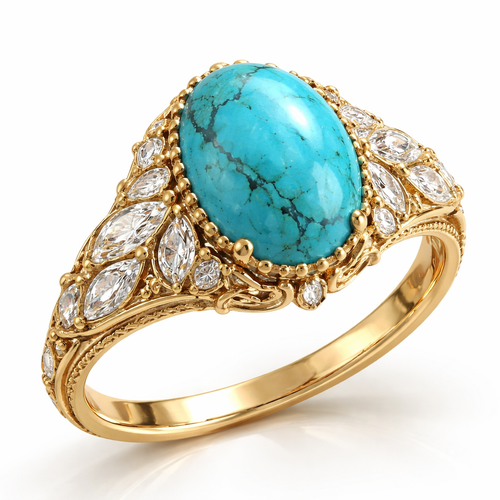 Big turquoise oval gemstone with different size Marquette diamonds and yellow gold band