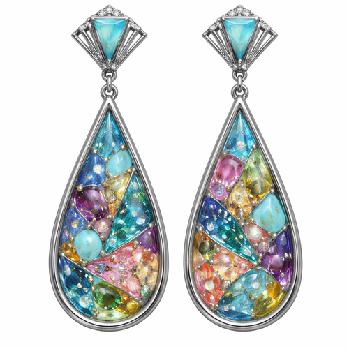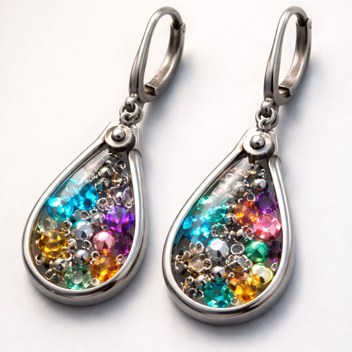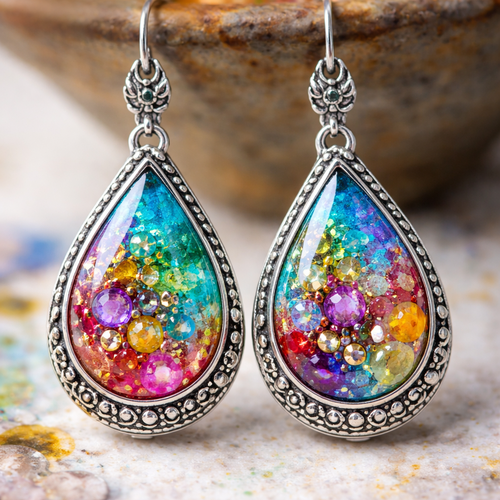Colourful resin drop earrings in silver with embedded stones or beads