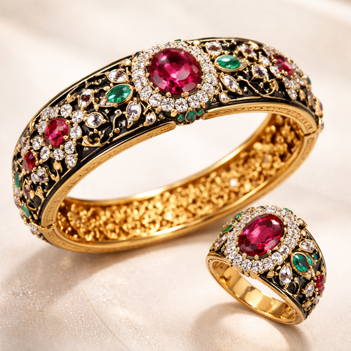 Design Ruby / zircon / Emerald / black meena kada and ring , delicate. Another version of this please