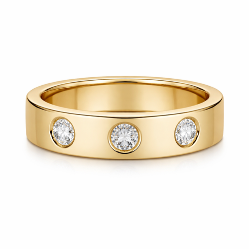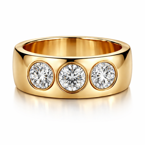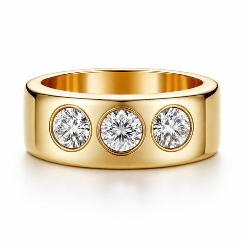 Yellow gold cigar ring (make it 18% thinner) with three 0.25 carat round diamonds inset . Make sure they are spaced well...