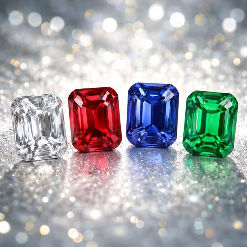Diamant, Rubin, saphir und Smaragd als einzelne Steine, herausstechender Hintergrund, emarald shape