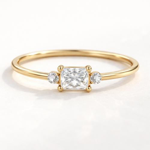 Rectangular princess cut diamond in the middle, 1 stone each on side, thin gold ring