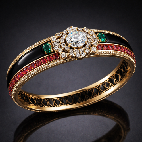 Ruby lines on side with black meena an zircon in centre and emerald baguette to hold the kada