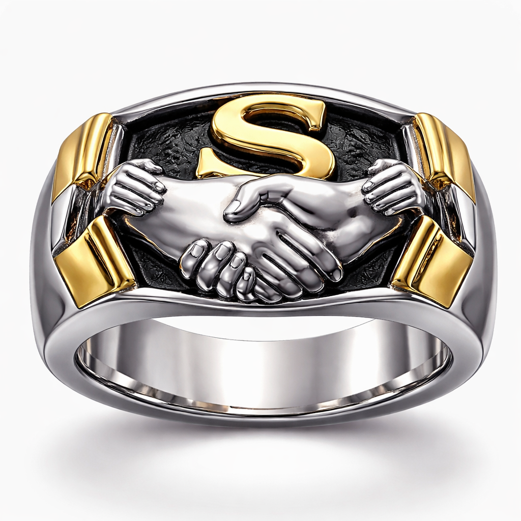 A women's ring. Anillo para hombre con dos manos agarradas y 2 manos pequeñas sujetando las manos y una S al fondo, modern style