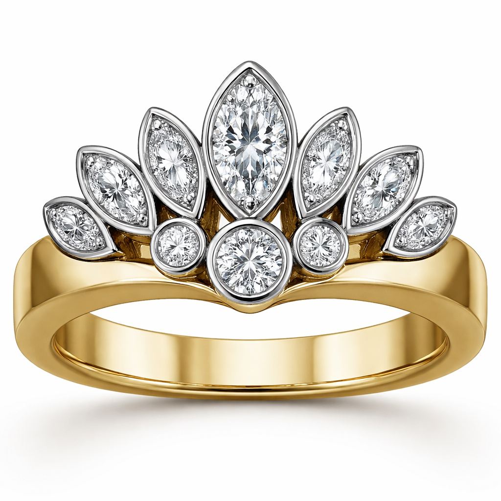 .6 karat marquise centered, with .25 round directly under it with 6 more smaller marquise diamonds and 2 .15 round diamonds mounted on a wide 14k yellow gold band. Make the design in a fan shape and use platinum prongs