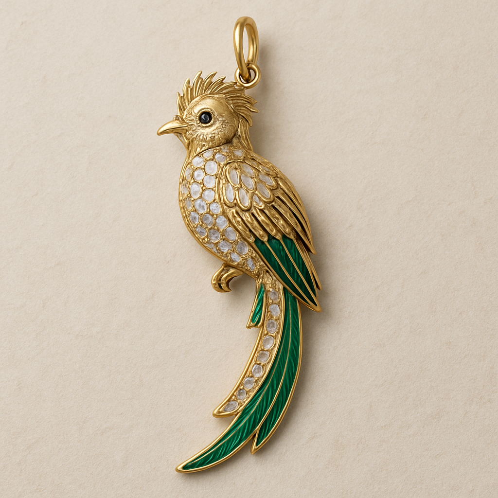 Charm ave quetzal con diamantes en su cuerpo