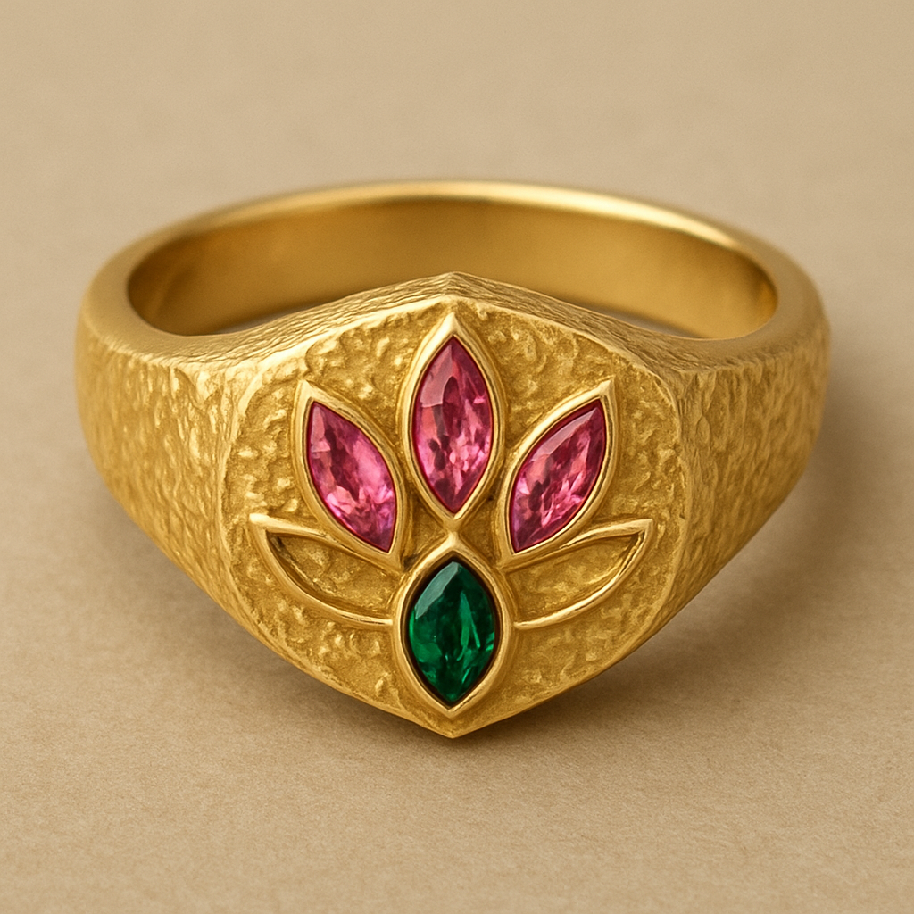 gold signet ring, textured on the top, 3 marquise pink gems on top and a green gem at the bottom (the shape of a lotus), gold style