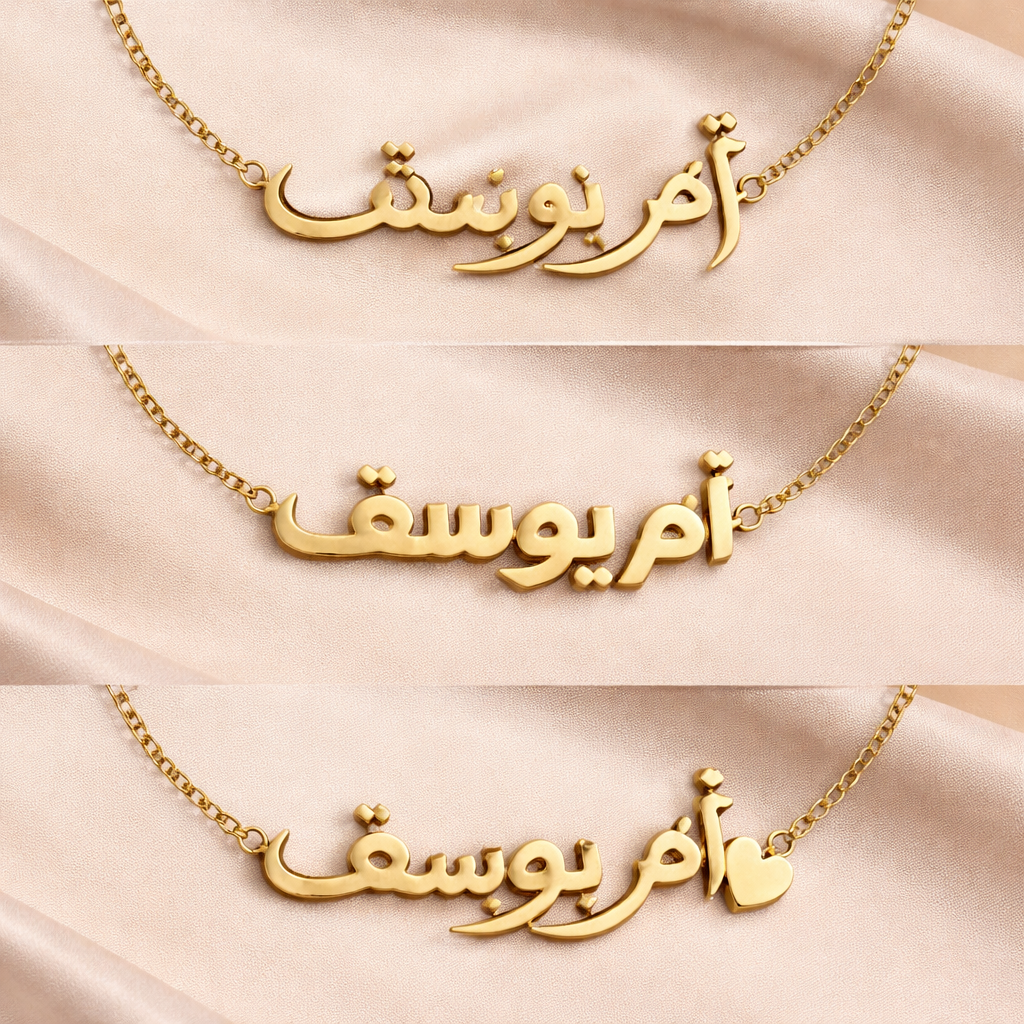 I would like to create custom name necklaces. Arabic name: أم يوسف Please create 3 design options: 1. elegant unique arabic calligraphy style 2. Slightly bold modern style 3. Elegant style with a small heart detail 4. Pvd gold plating 5. No spaces between two words 6. Pressed name slight half round design