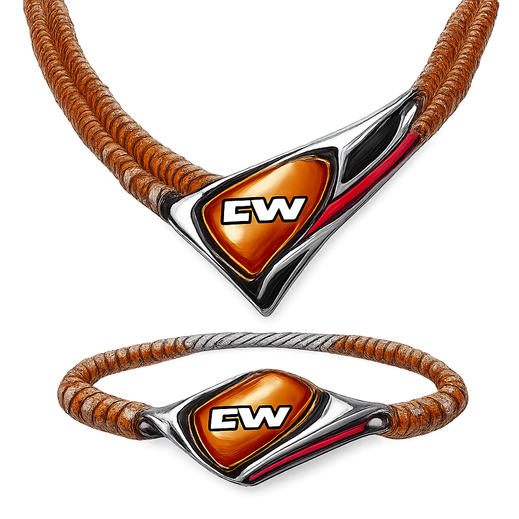 Necklace and bracelet only amber stones small size EVW logo on the amber stone red and black and white colours , avant_garde style