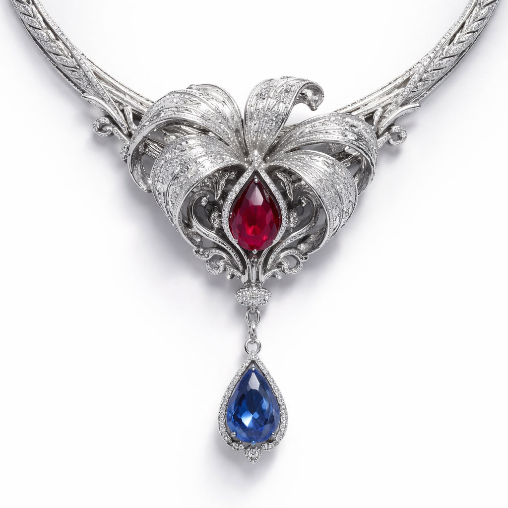 the middle of necklace with a flower with curved edges, curling under and a red ruby placed underneath where they’re in a locking are where the flowers placed with a hanging piece a short hanging piece with a blue sapphire on the end, avant_garde style