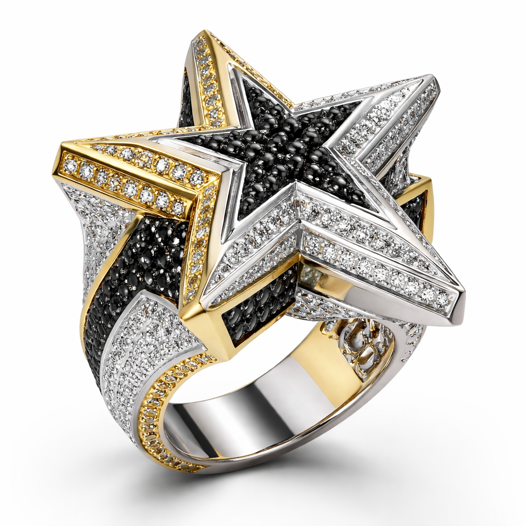 Geomatric star ring of architecture shape and bold edgy style of white diamonds and black diamonds with white and yellow gold with white background