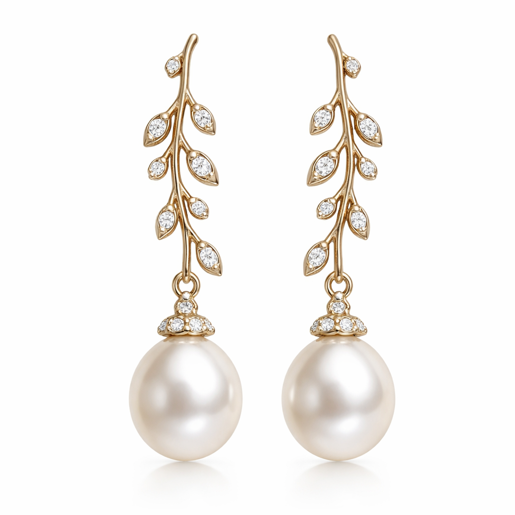 Small Gold pearl drop earrings with an olive branch and vine design and small white diamonds , romantic style