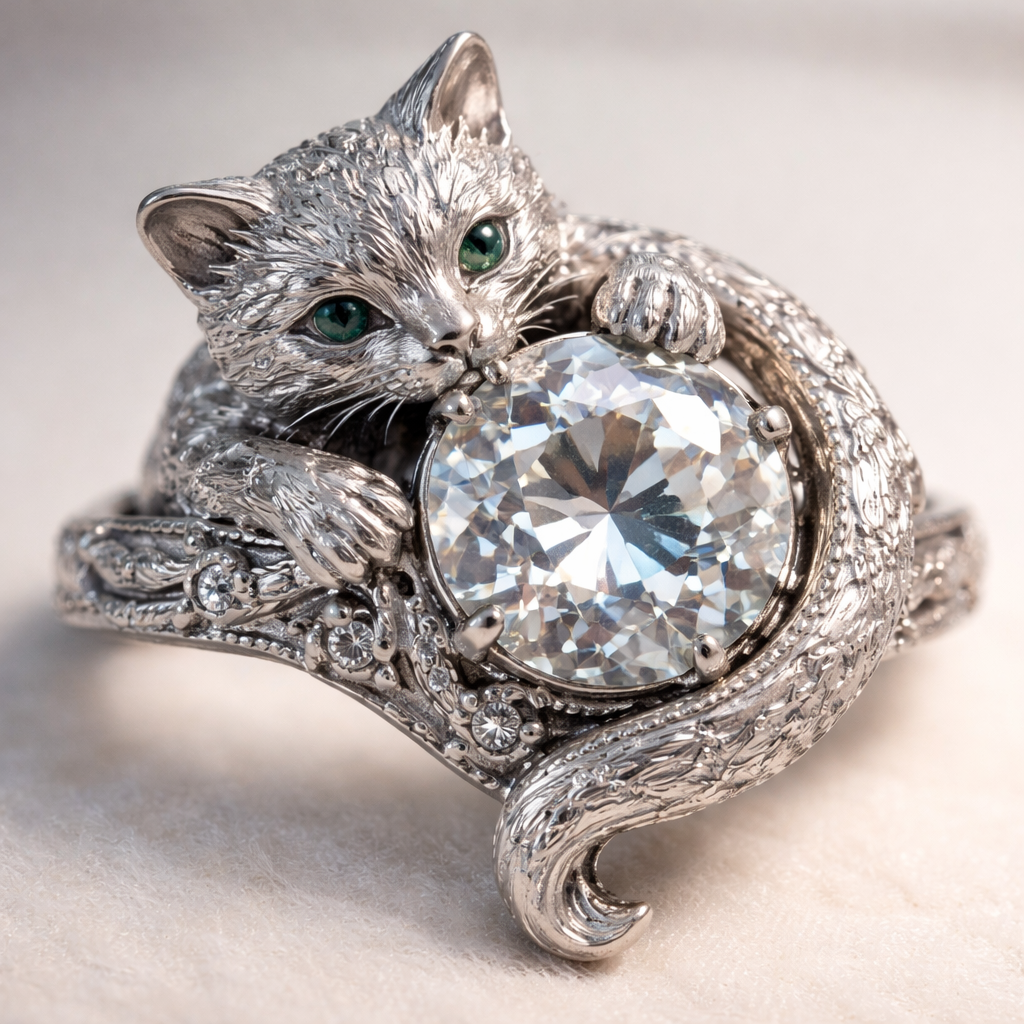 Cat wrapped around an old mine cut solitaire diamond, edwardian style
