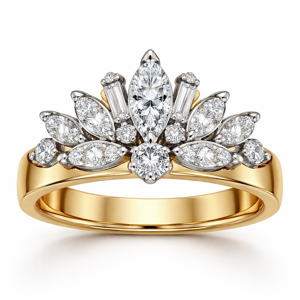 Ring AI Create a ring in 14k yellow gold, set in platinum. The center stone is a .60 size marquise diamond with a .25 round diamond set directly under the marquise. Add 6 more marquise shaped diamonds and 2 more round diamonds and 4 to 6 rectangle shaped baguettes in the shape of a crown with a 4mm thick gold yellow gold band, contemporary style