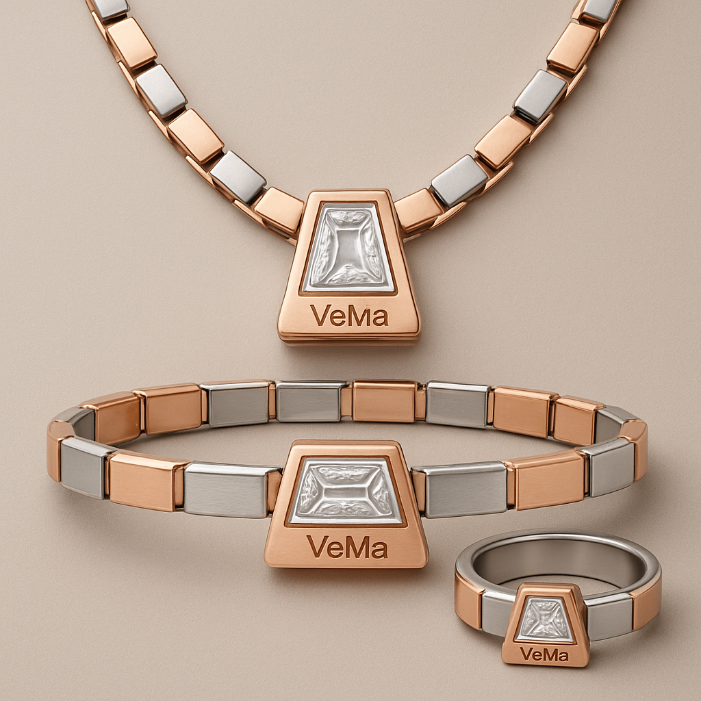 Eckige Kette und Armband und Ring 1cm breit in rosé und Silber Front gemischt mit einem Diamanten in Form eines Trapez in weiß und rosa alle innen Gravur VeMa, luxury style