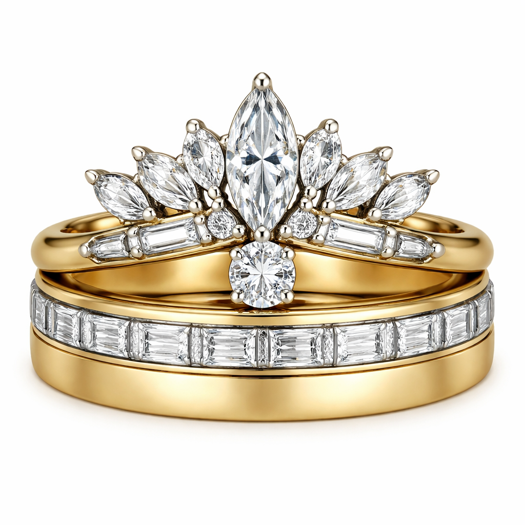 Create a ring in 14k yellow gold, set in platinum. The center stone is a .60 size marquise diamond with a .25 round diamond set directly under the marquise. Add 6 more marquise shaped diamonds and 2 more round diamonds and 4 to 6 rectangle shaped baguettes in the shape of a crown with a 4mm thick gold yellow gold band. Add a 5mm yellow gold wedding band with 2 rows of square baguettes set in platinum and sitting flush with each other , minimalist style