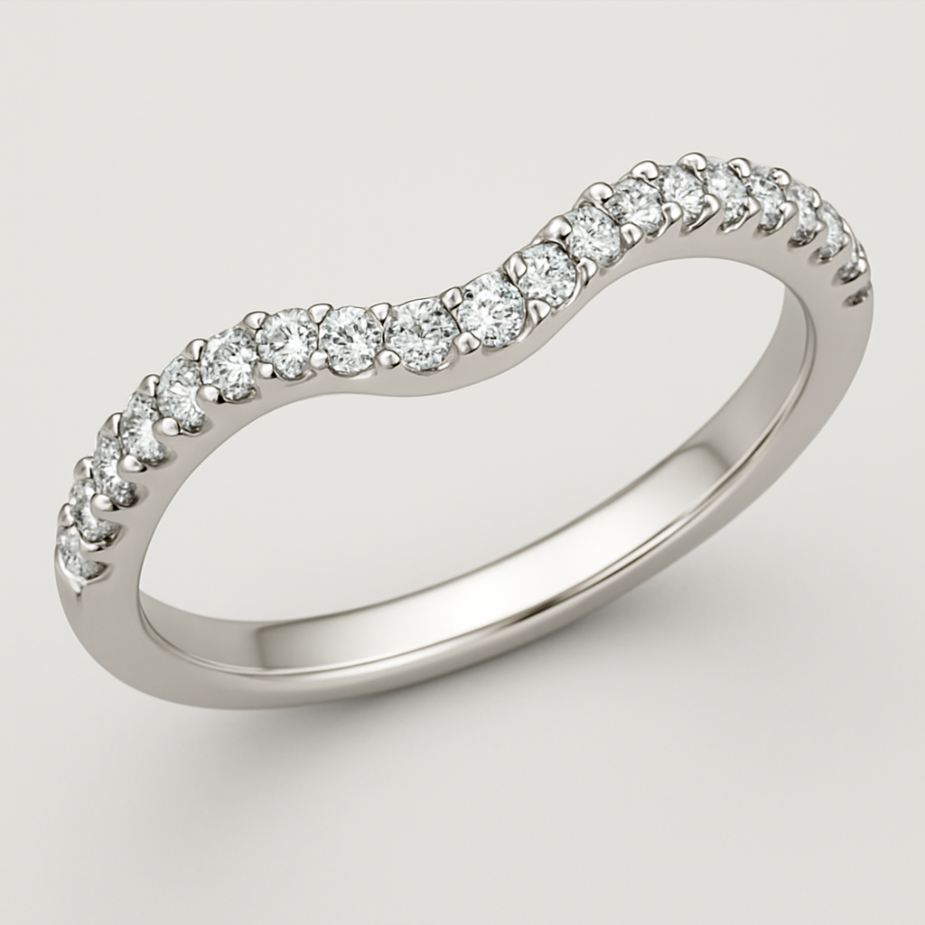Curved wedding band in white gold, with 25 x 1mm small round diamonds, prong setting.