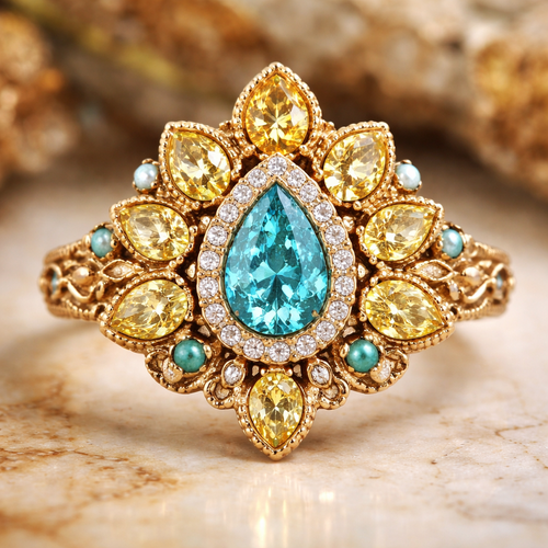 A bohemian women's ring. 7粒水滴小黃鑽石和1粒40份帕拉伊巴