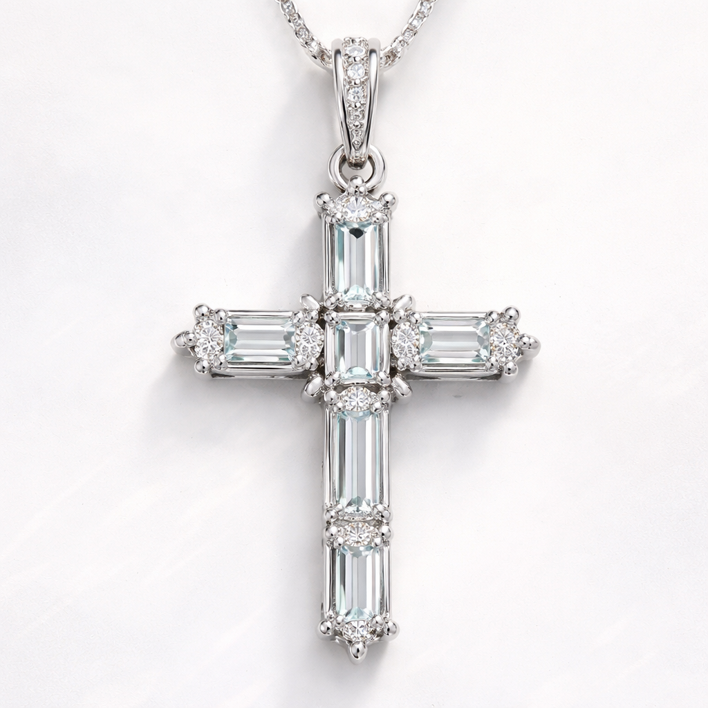 Simple white gold emerald cut cross with minima diamond accents and light metal work.
