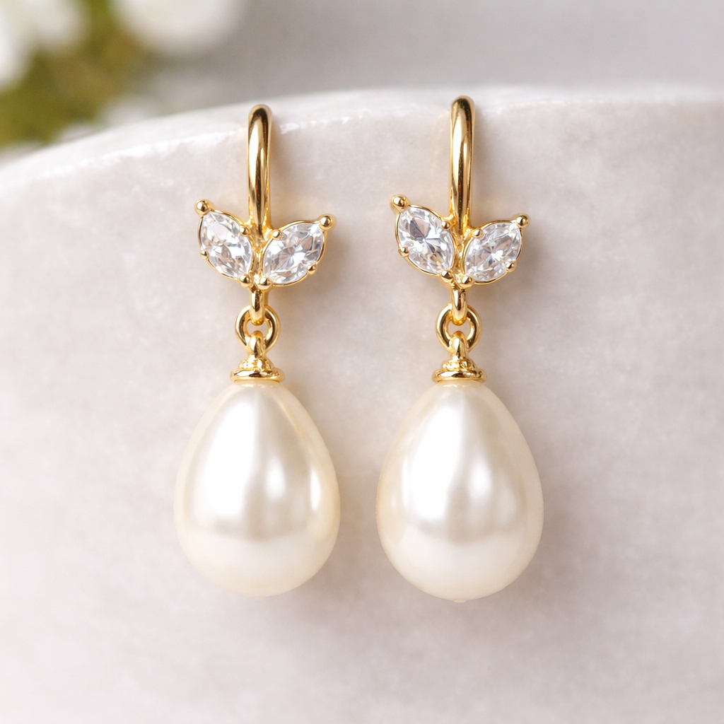 Short Gold pear shaped Pearl drop earrings with white sapphires as leaves, everyday style