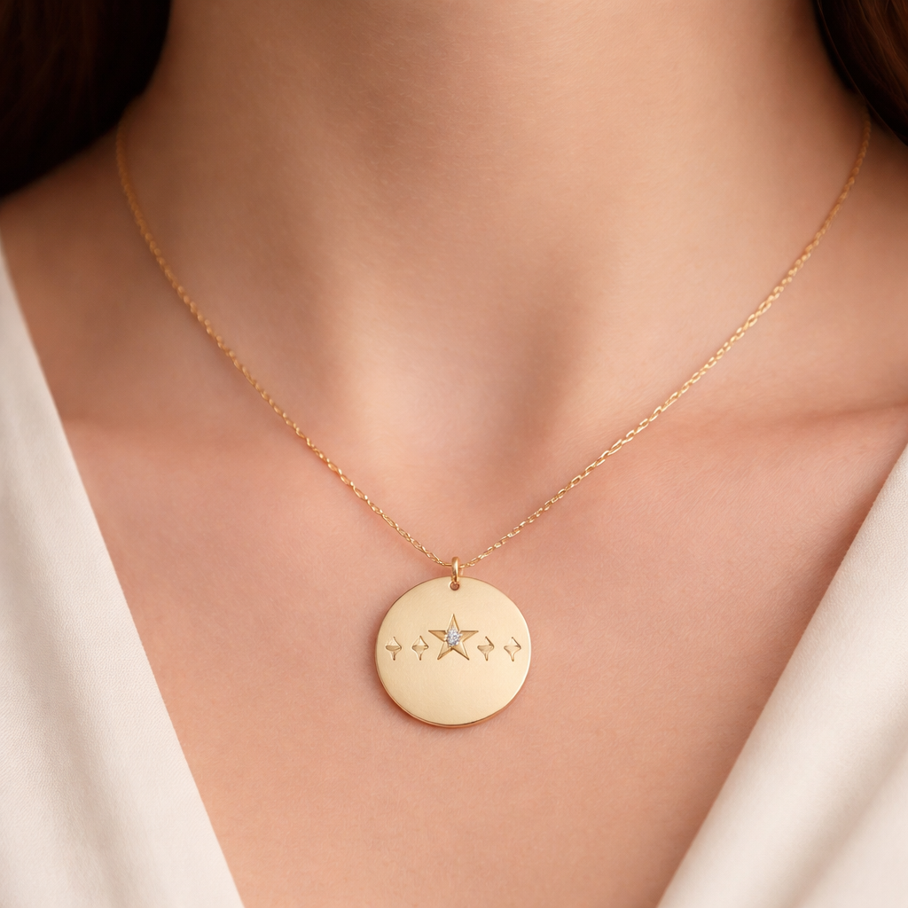 A minimalist women's necklace. colar redondo com as fases da lua e uma estrela de 6 pontas ao meio, minimalist style