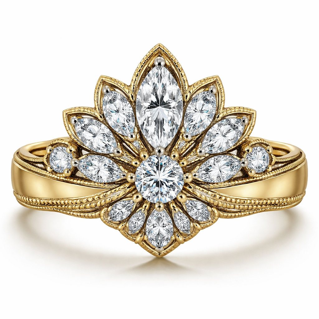 .6 karat marquise centered, with .25 round directly under it with 6 more smaller marquise diamonds and 2 .15 round diamonds mounted on a wide 14k yellow gold band. Make the design in a fan shape and use platinum prongs