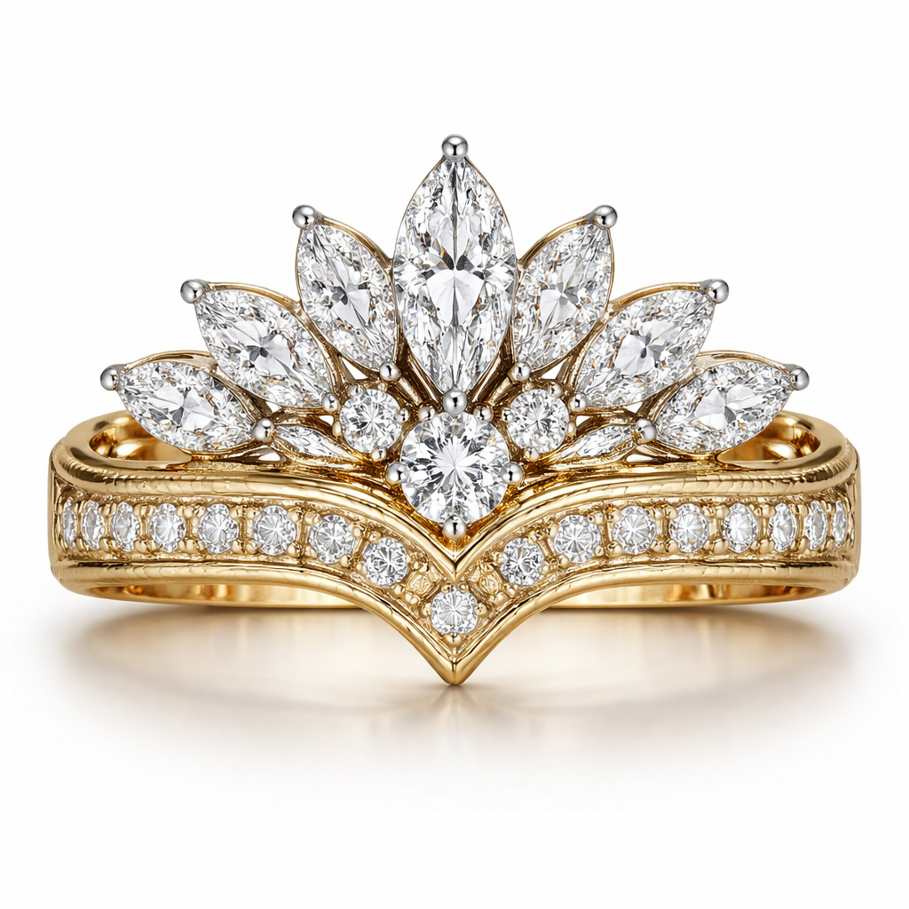 .6 karat marquise centered, with .25 round directly under it with 6 more smaller marquise diamonds and 2 .15 round diamonds mounted on a wide 14k yellow gold band. Make the design in a fan shape and use platinum prongs, royal style