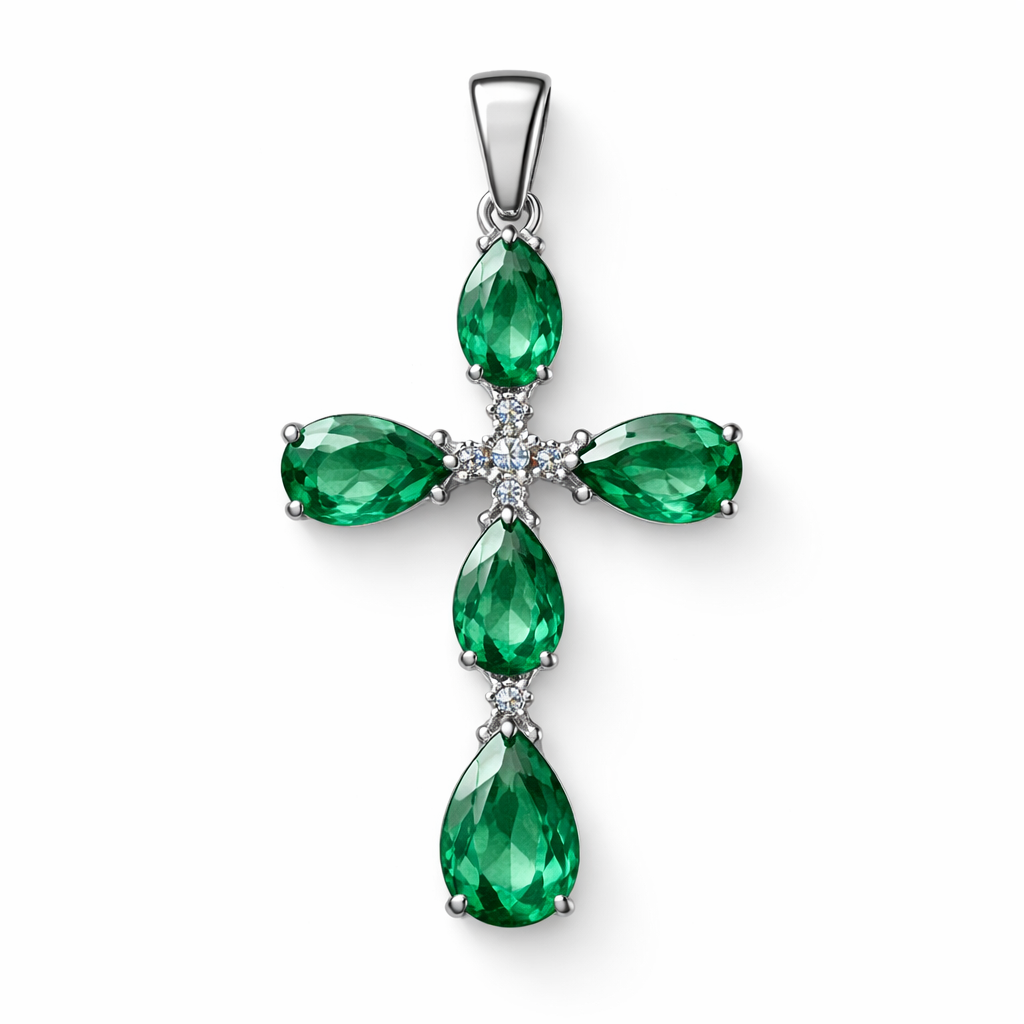 Faceted pear cut emerald white gold cross with 2 small diamond accent stones in between each emerald. White gold bale with no diamonds. , minimalist style