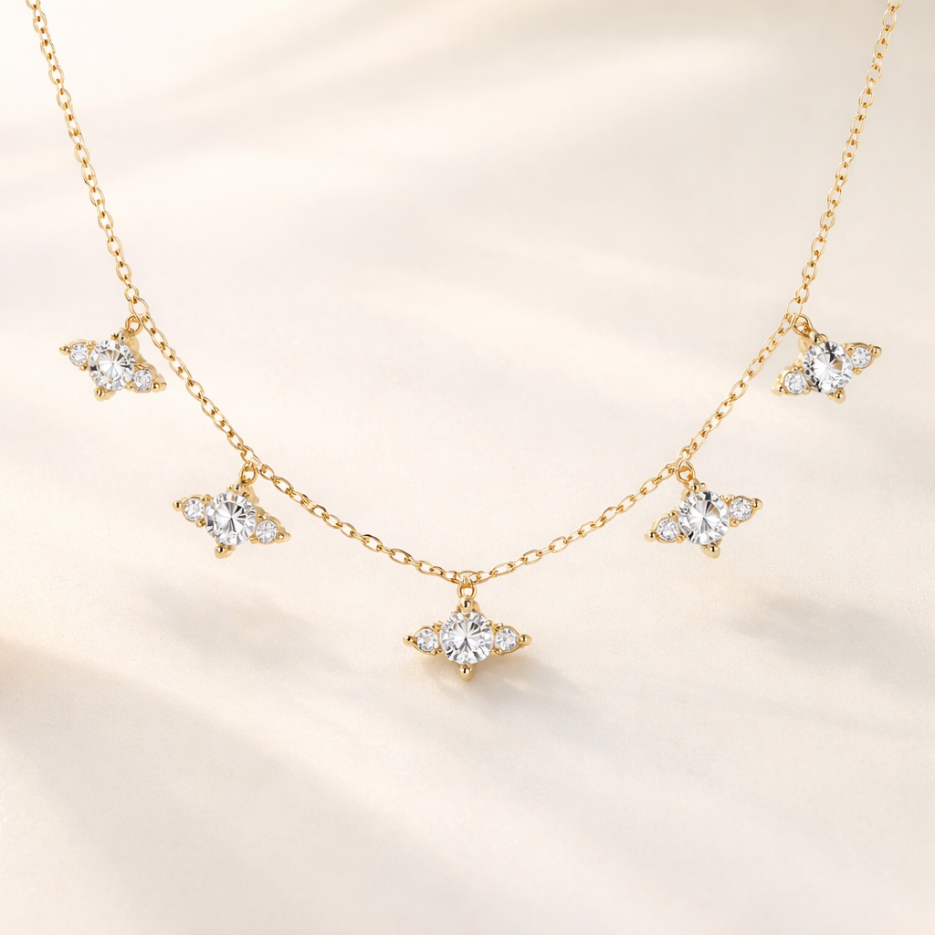 A chain with 5 pendants scattered , each pendant will have a solitaire in the centre and a marquis on each side of the solitaire
