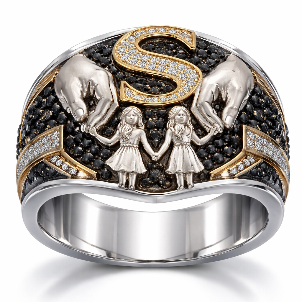 A women's ring. Anillo para hombre con 2 manos y 2 niñas pequeñas sujetandose de la mano y una letra S atras, modern style