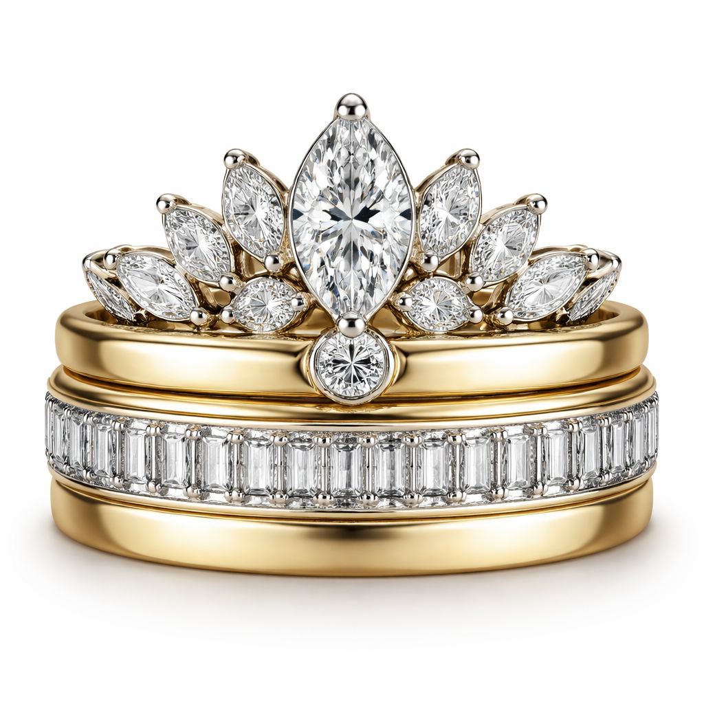 Create a ring in 14k yellow gold, set in platinum. The center stone is a .60 size marquise diamond with a .25 round diamond set directly under the marquise. Add 6 more marquise shaped diamonds and 2 more round diamonds and 4 to 6 rectangle shaped baguettes in the shape of a crown with a 4mm thick gold yellow gold band. Add a 5mm yellow gold wedding band with 2 rows of square baguettes set in platinum and sitting flush with each other , vintage style