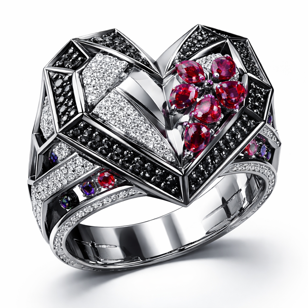 Modern Geometric ring of heart of architecture shape and edges of bold style with white and black diamond and stones of ruby of white background with edgy style
