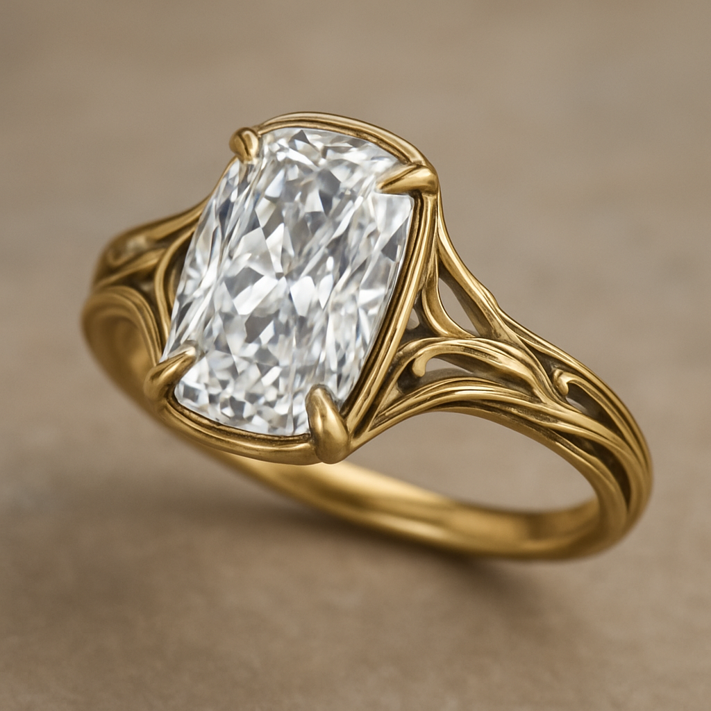Elongated cushion, cut diamond set in yellow gold band, taping with Talon prongs, art_nouveau style