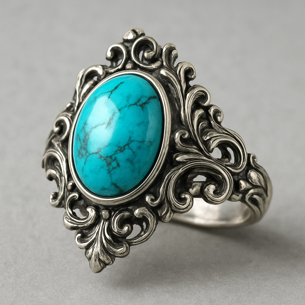 Turquoise cabochon on silver ring, baroque style