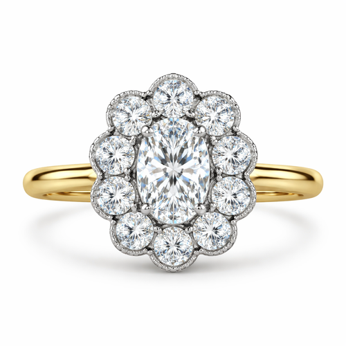 Create a flower style ring with a three-quarter carat Oval center stone and eight round stones set around the center sto...