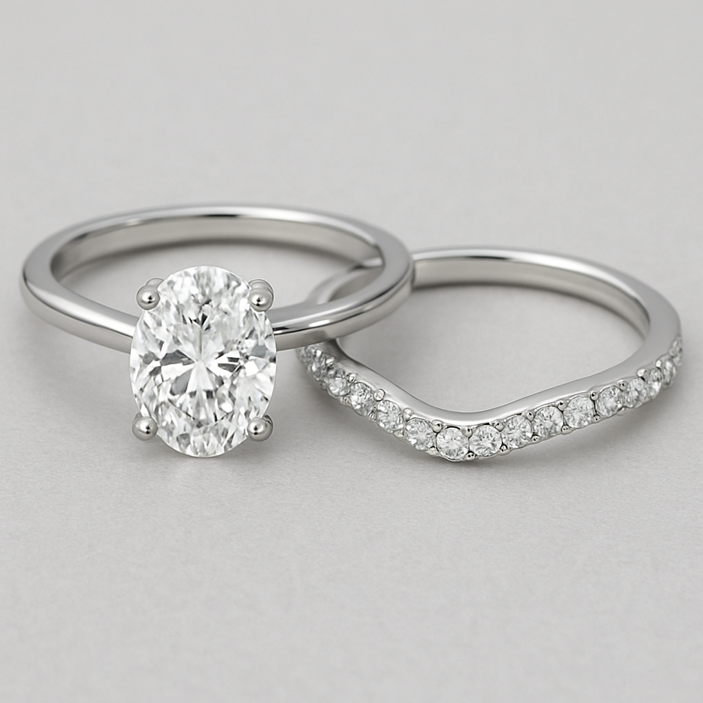 Platinum solitaire ring with a 1.50ct oval diamond in a prong setting, next to a curved platinum wedding band with 25 x 1mm round diamonds in a claw setting.