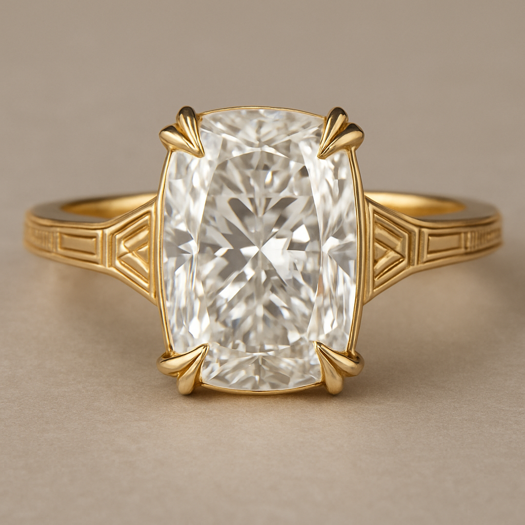 Elongated cushion diamond in yellow gold with Talon prongs at north south east and west Talon prongs, art_deco style