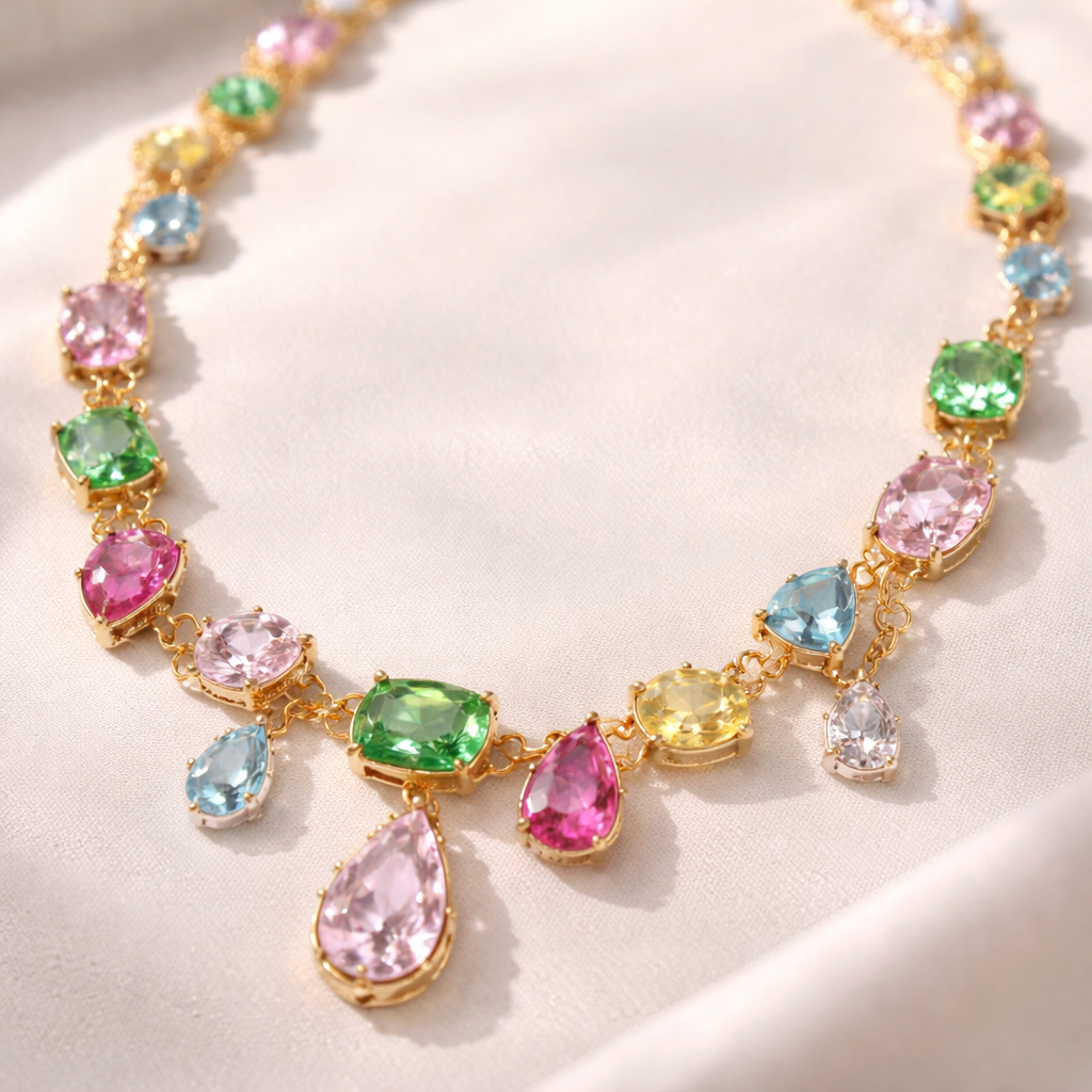 Gem stone necklace on a gold chain. Gem stones are connected throughout the entire chain. Different shapes and colors are light pink, hot pink, green, light blue, yellow, and white , bespoke style