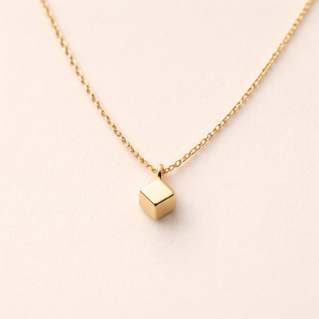 Minimalist jewelry: Minimalist gold pendant. Smooth, polished finish. Small, geometric shape. Delicate chain. Simple, elegant, understated design.