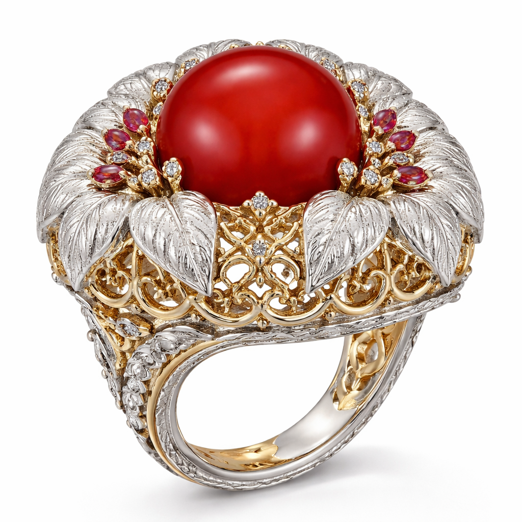 A 35mm round statement ring inspired by the iconic Buccellati style. The composition features camellia leaves gently opening outward, creating a soft yet structured floral silhouette. The base is crafted with an intricate openwork lattice, enhancing lightness and refinement. At the center sits a vivid oxblood red coral cabochon, rich and commanding. Flanking both sides at a 45-degree angle, delicate stamens unfold, set with fine ruby accents that add brilliance and depth to the composition. The shank is designed in an elegant Italian style, with graceful lines and a balanced proportion, completing the ring with a sense of timeless sophistication and artisanal luxury.