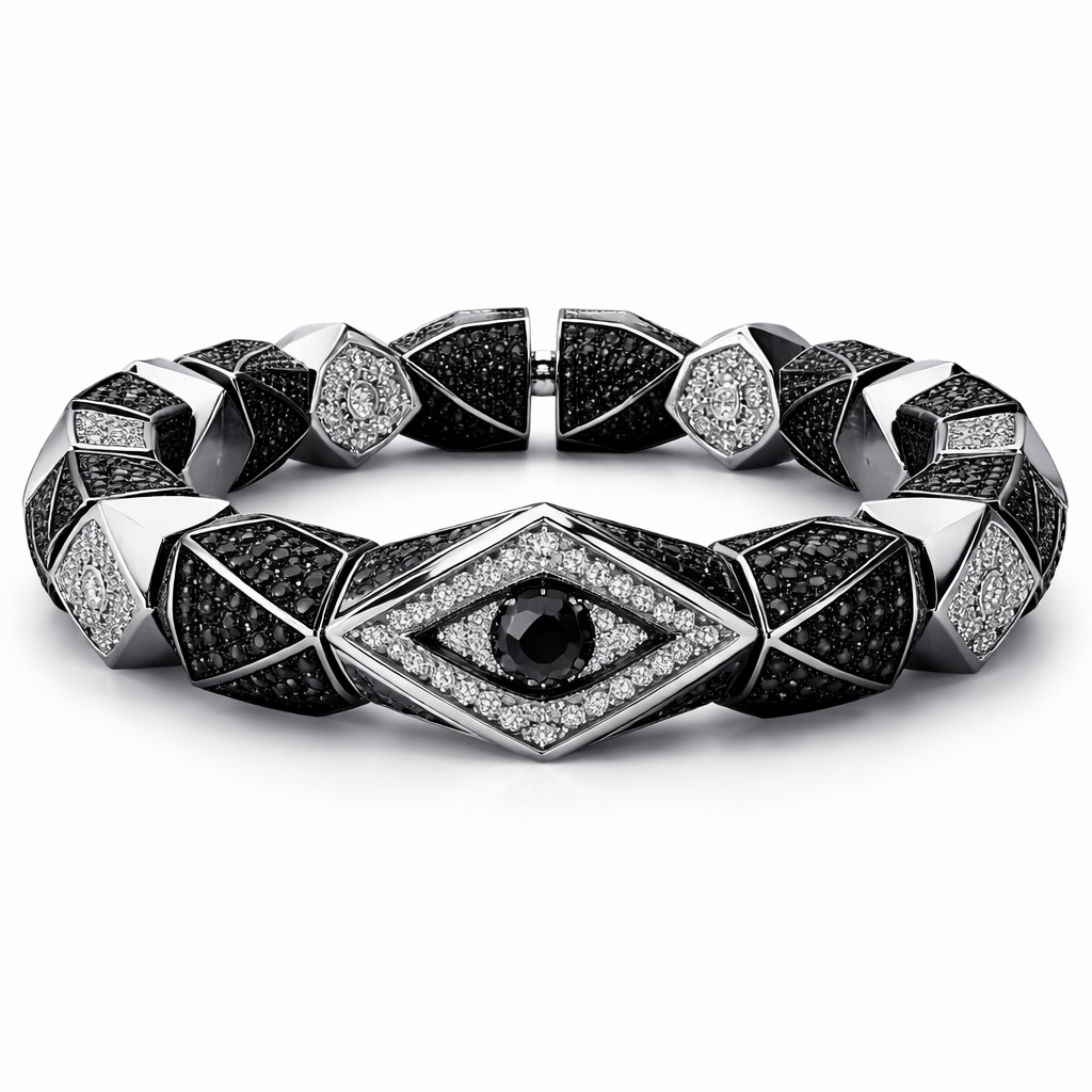 Geomatricw sharp edges of architectural shapes and design of bracelet beads for men of white and ablack diamonds adding eye shape in abstract and artistically way with white background
