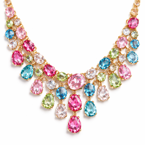 Gold prong set Gemstone necklace. Gems are different sizes and the colors are light pink, hot pink, blue, light green, a...