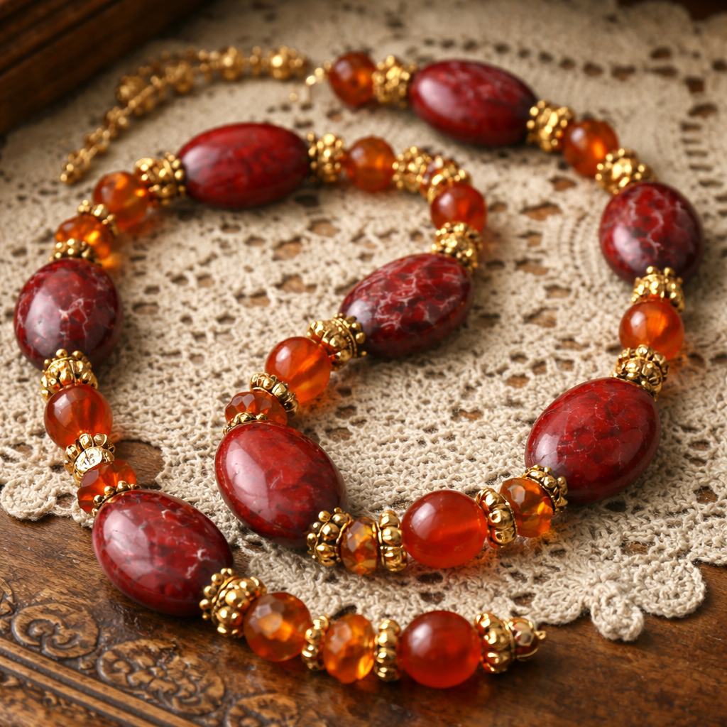"Red vein Jasper beads carnelian beads and orange Czech glass spacer beads with gold bead findings necklace " , vintage style