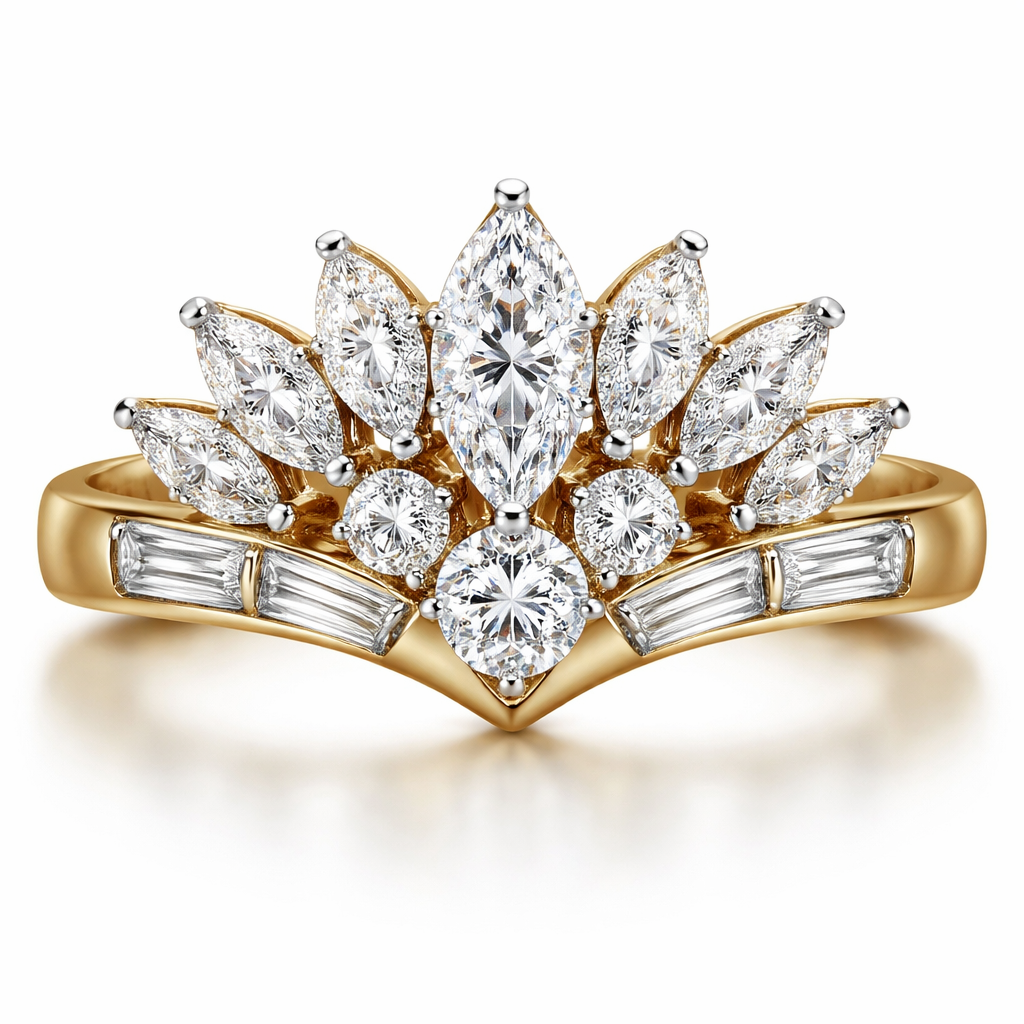 .6 karat marquise centered, with .25 round directly under it with 6 more smaller marquise diamonds and 2 .15 round diamonds mounted on a wide 14k yellow gold band. Make the design in a fan shape and use platinum prongs add some baguette diamonds also this is the exact size of the 6 smaller marquise stones and the baguette stones , classic style