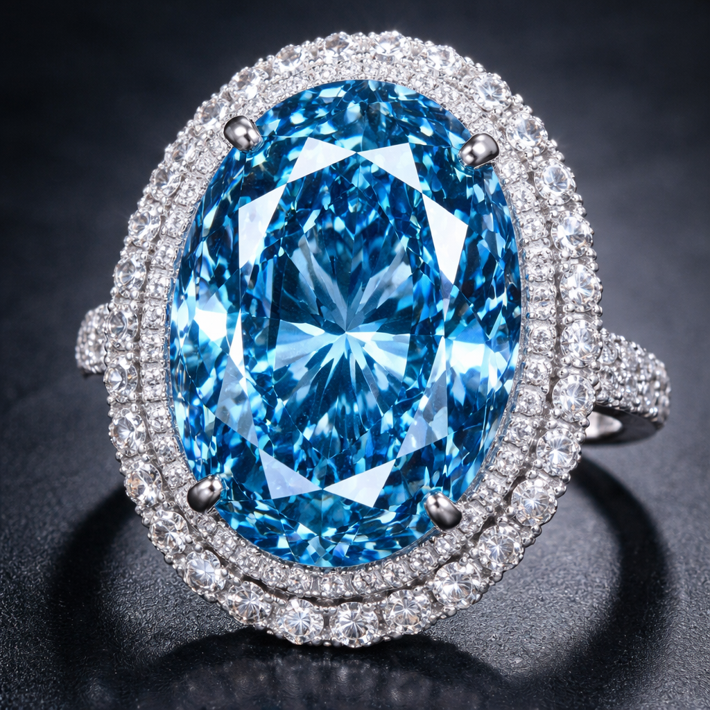 A ring of with a giant 50 carat oval shaped blue diamond , halo style