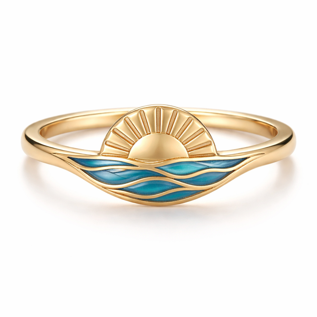 Keep it as ring not necklace as before bottom rays melting in the curve like its sun setting in the ocean leave the gold and the details but add a hint of blue reminding us of the ocean, minimalist style