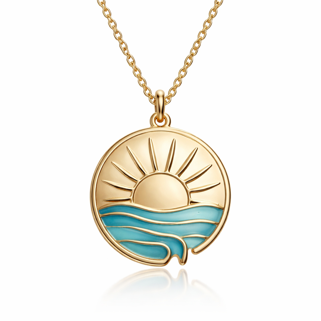 Love it but Make the bottom rays melting in the curve like its sun setting in the ocean leave the gold and the details but add a hint of blue reminding us of the ocean, minimalist style