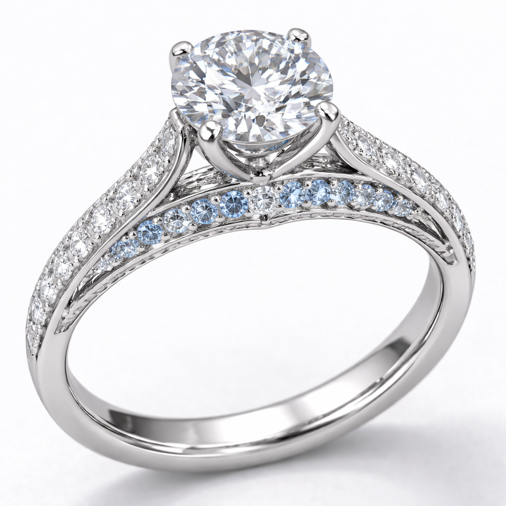2ct round Diamond in a platinum cathedral setting with diamonds on the band a bridge with baby blue sapphires with a guard rail