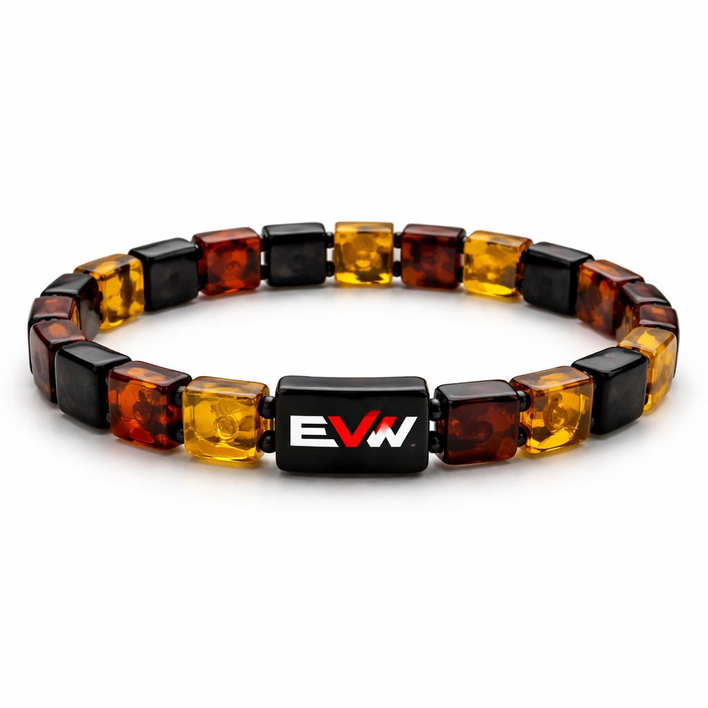 Do not use silver or gold or bronze and bracelet for man only amber different shapes square stones small size EVW logo on the amber stone red and black and white colours