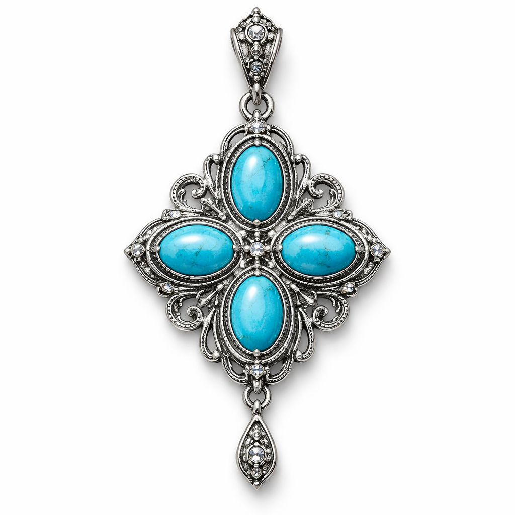 Four 6x4 calibrated oval turquoise cabochons set in silver pendant, victorian style